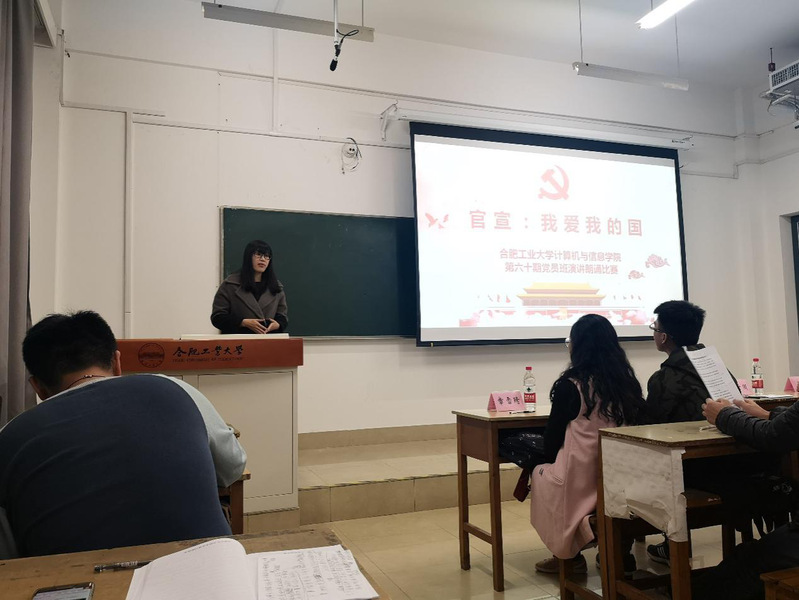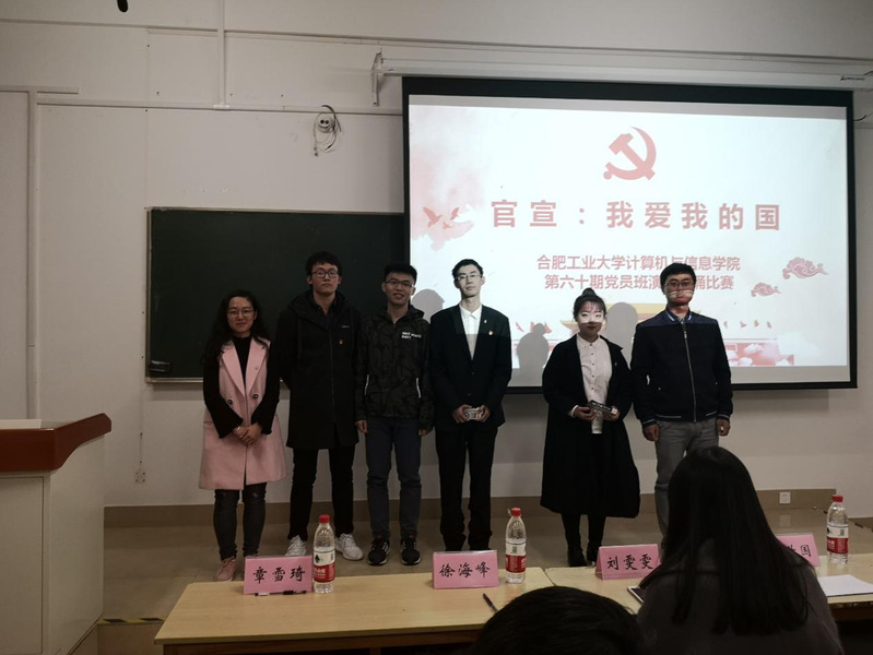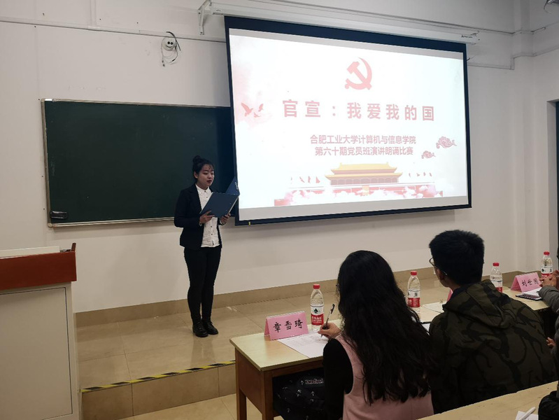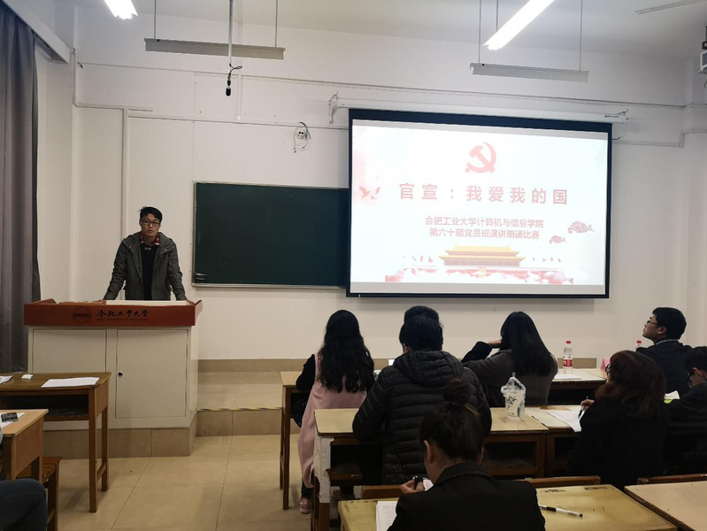 为深入学习贯彻全国教育大会精神,弘扬爱国主义精神,在第60期党员班学员中厚植爱国主义情怀,讴歌改革开放四十年党和国家各项事业所取得的辉煌成就,展现党员风采。beat365中国唯一官方网站第60期党员班于2018年11月11日晚七点在翡翠湖校区3教309举办主题为“官宣,我爱我的国”朗诵演讲比赛。学院相关负责老师以及各专业党支部副书记等出席并担任评委,党员班55位成员参加本次活动。
