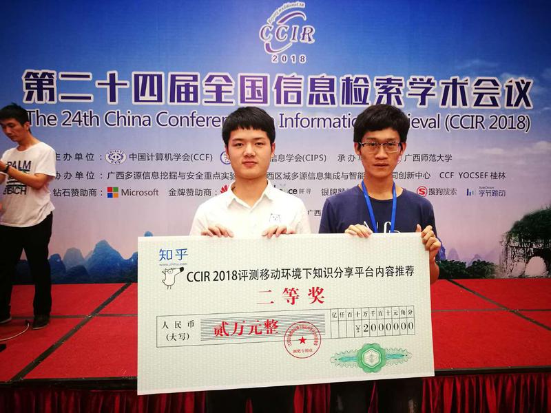 近日,在桂林举行的中国信息检索2018年会(CCIR2018)上,beat365中国唯一官方网站“媒体与推荐系统实验室(HFUT_MARS)”在由知乎公司、中国计算机学会信息检索专委会(CCIR)、清华大学计算机系联合主办的“移动环境下知识分享平台上的内容推荐竞赛(以下简称知乎在线推荐算法竞赛)”中获得第二名(本次比赛设一等奖1名,二等奖2名,三等奖4名),并受邀在大会上做算法交流报告。
