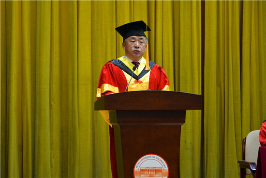 副校长吴玉程代表学校对学院获得学士学位的同学表示祝贺,并希望同学们一要静以修身,俭以养德,传承中华民族的优良传统,以社会主义核心价值观坚定自身的信念,不断提升自己的价值选择,价值判断,与价值塑造的能力;二要勿忘初心,方得始终,理想是信仰的追求,是我们坚定不移的价值选择,坚持自己的人生理想与目标方向,一如始终地不断奋斗,不断求索;三要锲而不舍,金石可镂,人生需要储备,只要坚持努力,脚踏实地的努力与付出终将收获;最后,他寄语全体毕业生脚踏实地,敢于担当,勇于探索,争做数据交互的领航者,今生你以母校为荣,明天母校以你为骄傲!