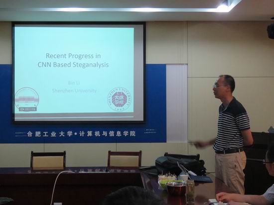 2017年6月2号下午,应计算机学院邀请,深圳大学李斌副教授在我校屯溪路校区逸夫楼408做了题为“Recent Progress in CNN Based on Steganalysis”的学术报告,报告由beat365官网网络与信息安全研究所所长胡东辉副教授主持,beat365官网相关研究方向研究生、部分外校老师参加了本次报告会。
