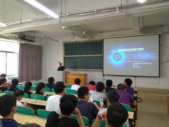 认知实习动员大会同时邀请了相关业内专家给同学们做报告。安徽兴业银行信息科技部的邢大红给同学们介绍了金融科技的发展历程,从金融IT阶段的通过传统IT的软硬件的应用来实现办公和业务的电子化,接着介绍互联网金融阶段的利用互联网或者移动终端的渠道来汇集海量的用户和信息,最后分析新科技应用阶段。同时鼓励同学们要成为复合型人才。