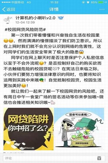 重视“校园网贷”网络思想教育。充分发挥学院新媒体平台融合优势,通过beat365官网青年新媒体中心,充分利用QQ“计算机的小喇叭”、官方微信等线上平台推送主题教育图片、不良校园网贷案例,线上“倡导科学理性消费 远离不良校园网贷”倡议活动,学生即时查看并互动参与,引导学生理性消费,科学消费,自觉抵制不良网贷。
