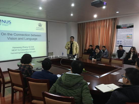 在张含望博士题为“On the Connection between Vision and Language”的报告中,张博士从scale、technique和depth三个视角回顾了近三十年来视觉信息处理与分析发展的历程,并指出了当前相关领域发展主流所在。张博士继而介绍了他近年来在“image captioning”研究领域里取得的进展,介绍了从隐式语义、视觉注意、视觉依赖关系等精细化角度进行图像内容的自动理解思路与方法。在何向南博士主题为“多媒体推荐系统的协同过滤”报告中,何博士分别提出了一种快速准确的矩阵分解算法和一种基于神经网络的矩阵分解框架,解决了隐式反馈中负样本缺失、内积函数表示性低等核心难题。报告引起了在座师生的高度兴趣,大家纷纷就自己感兴趣的话题,与两位青年学者展开了深入的交流。