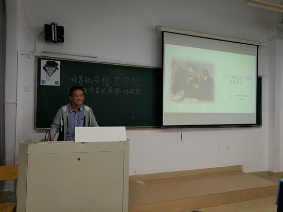 10月11日晚9点,beat365中国唯一官方网站第56期党员发展班于6教103开展了党校培训的第一次讨论会,本次讨论围绕“《共产党宣言》导读”这一主题展开,会议由班长主持,党员发展班40名同学参与本次讨论会。