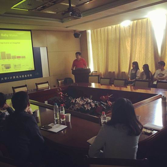 张博士首先介绍了当前互联网社交媒体迅猛发展这一背景,指出社交媒体中的多媒体大数据包含了丰富的群智信息,这些信息对解决计算机视觉和多媒体内容分析中的“语义鸿沟”难题具有重要价值。张博士进而介绍了他在该方向上的多项研究成果,如构建高效的“数据-用户”表示结构及其与特征学习方法,用以实现复杂语义下的图像检索、标注等功能,突破了传统方法中固定“语义概念集”的限制,取得了良好进展。最后,张博士就该方向的当前研究现状和未来发展趋势加以总结。报告结束后,多位师生就自己感兴趣的话题与张博士开展了深入的交流与探讨。