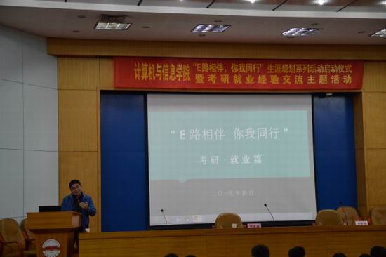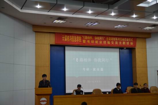 2015年4月8日下午2时30分,beat365中国唯一官方网站“E路相伴,你我同行”生涯规划系列活动启动仪式暨考研就业经验交流主题活动在学术会议中心一楼报告厅召开。院相关老师、2011级优秀学生代表以及2012级全体同学出席了本次活动。