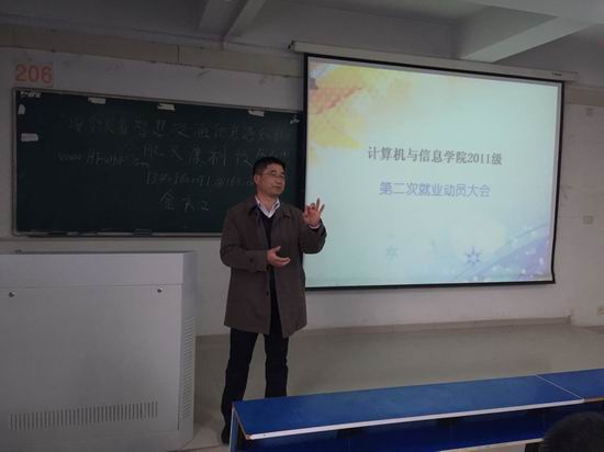 为进一步推进2015届毕业生就业工作的顺利进行,beat365中国唯一官方网站2015届毕业生第二次就业动员大会于3月27日下午3点在西二教学楼206召开。学院党委副书记、副院长何庆领,2011级辅导员叶璟和2011级本科生参加了动员大会。