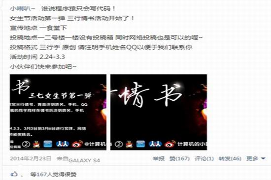 本次女生节共分为“笔墨之痕诉相思”三行情书、“倚此漆墨润相思”定制明信片、“于此一隅待归人”心愿达成和“E路相伴•爱在工大”游园会四个部分。其中三行情书、明信片定制、心愿达成活动得到了全校同学的广泛参与,大家纷纷以优秀的作品,诚挚的明信片,美好的心愿实现表达对女生的尊重,充分体现出工科学子的人文与浪漫情怀。本次活动开设网络在线参与模式,重视各环节的活动成果展示,取得了良好的活动宣传与在线互动效应。三七游园会特邀请外国语学院和电子科学与应用物理学院的女生们共同参与,采用货币共通制度,由学院各班级承办的特色节目与现场游戏供在场观众欣赏游玩,同时倾情奉献学院师生们对广大女生的节日祝福视频,寓教于乐,增强大家的发散思维与综合能力,游园会在一片热闹欢呼声中圆满落幕。