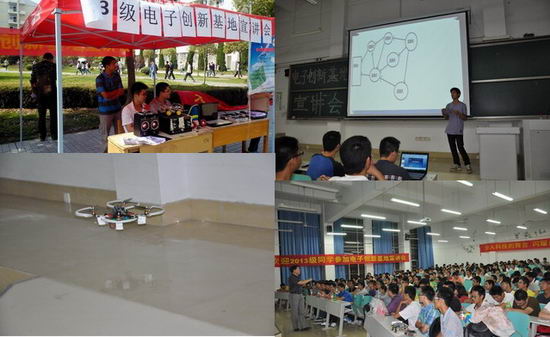 创新基地老师对学生做了创新基地相关情况的介绍,阐述了学院电子信息创新基地的三个重要作用:一、通过高年级创新基地成员以传、帮、带的形式对新加入基地成员进行相关基础知识的培训;二、以各类电子设计竞赛为抓手,着力提高学生的创新实践能力和团队合作的精神;三、以各类大学生创新创业项目为载体,狠抓大学生的创新实践能力的培养,始终践行学院大学生创新实践能力培养的CSNEW模式。随后大三的优秀学长结合自己创新实践的实际给大家介绍心得和体会,宣讲会上穿插了今年全国电子设计竞赛二等奖作品四翼飞行器的现场演示把宣讲会的气氛推向了高潮,最后的提问环节,同学们十分踊跃,创新基地的老师都逐一进行了回答。