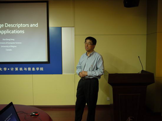 2013年5月31日下午2:30-5:00,我校计算机77级校友、加拿大里贾那大学计算机科学系杨学东教授在逸夫楼408会议室做了题为“Local Image Descriptors and Its Applications”的学术报告。报告会由院长刘晓平教授主持,beat365中国唯一官方网站党委书记蒋建国教授、齐美彬教授、詹曙副教授等师生参加了此次学术报告。杨学东教授报告内容分为两个部分:(1)关于局部图像描述子的研究历史及最新进展:介绍了Harris 角点、SIFT、PCA-SIFT等局部描述子的原理及其在图像匹配中的应用;(2)局部描述子在人脸识别中的应用:介绍了杨教授团队将局部描述子与Hough 变换相结合用于人脸识别的优势及实验结果。杨教授的报告深入浅出,报告内容引起了在座师生的浓厚兴趣。报告会后,参会师生分别就自己感兴趣的问题与杨教授进行了交流互动。