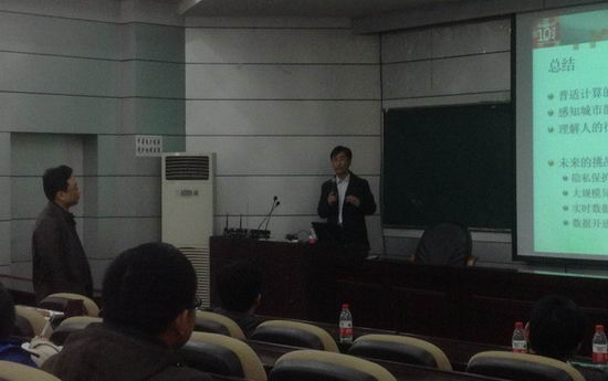 在报告中,谢幸博士介绍了普适计算研究的历史发展和最新前沿。谢博士首先为大家介绍了普适计算的发展历程,进而介绍了谢博士领导团队在城市计算、用户理解等方面的最新研究成果,最后谢博士就其研究领域中若干关键问题做了总结和展望。谢博士的报告涵盖了众多普适计算研究的最新进展,引起了在座师生的浓厚兴趣,进行了热烈的讨论。
