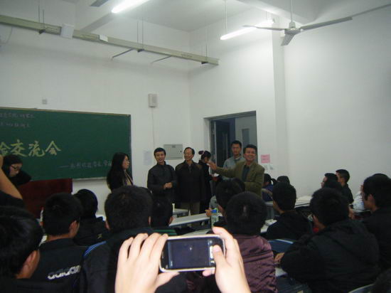 晚上七点半,“学长领航活动”第二项活动—成才经验交流会正式开始。参加活动的优秀研究生会干部分成八个小组与宣传校区的十六个班级进行对口交流,分别从学业规划、专业指导、学习心得、日常生活、感情态度以及班级社团建设等方面传授经验,赢得同学阵阵掌声。互动环节中,各班同学有针对性的向小组成员提出各类问题,学长们进行了详细的解答,现场气氛十分愉悦。蒋书记等领导来到交流现场看望同学,现场气氛达到高潮。同学们纷纷表示,经过这次的成才交流活动,更加坚定了努力学习,建设新校园的决心。