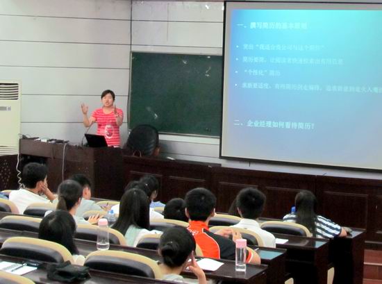 郑召丽老师系统讲解了如何制作简历,从“什么是简历及简历的目的”,“简历中的问题”, “简历的基本结构”“评估要点”四方面对简历制作的注意事项作了细致说明,其中重点讲解了“简历结构”这个部分。之后郑老师向大家展示了一份标准的优秀简历,并进行了讲解,让同学们从正反两方面了解到了如何写好简历。在这过程中也穿插了“简历找错”的环节,同学们踊跃发言,在欢快的气氛中了解到简历常见的问题。郑老师幽默风趣的语言,赢得了大家的阵阵掌声。