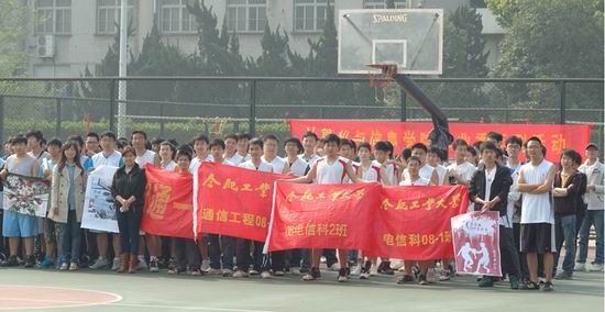 开幕式结束不久,进行了篮球比赛,各班级球员为了集体的荣誉,激烈的角逐,挥汗如雨,各种进攻战术和防守战术都应用的凌厉精致。经过大约一个半小时的激烈比拼,最终电子信息工程08-1班,通信工程08-1班,计算机08-4班分别战胜对手,获得了开门红。