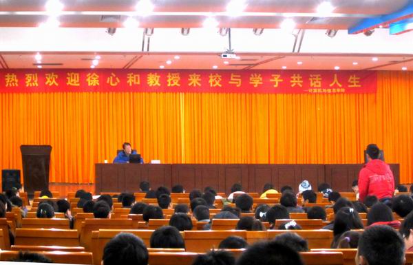 报告会上,徐心和教授主要从四个方面详细介绍了计算机博弈,分别是:计算机博弈的由来及发展、计算机博弈在中国、牛角棋博弈程序设计、2011全国大学生计算机博弈大赛项目简介。其中,徐教授以“牛角棋博弈程序设计”为例,深入浅出地将博弈的观点、思想、分析方法、设计技巧、思维信息的表示和存储等深奥知识传递给的低年级的学生,气氛非常热烈。徐教授精彩的报告激发了同学们对计算机博弈的无限兴趣和探索热情。随后,大家踊跃发言,咨询了很多有关计算机博弈方面的问题,教授也耐心详尽为同学们答疑解惑。最后,刘晓平院长对报告进行了总结并予以高度评价。会后,仍有很多学生意犹未尽围着徐教授探讨相关的问题,整场大会在浓浓的学术氛围中结束。