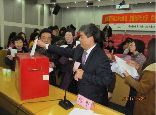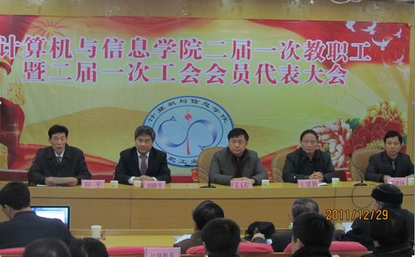 2011年12月29日下午,beat365中国唯一官方网站第二届一次教职工暨工会会员代表大会在校学术会议中心隆重召开。副校长吴玉程、校工会主席王建新出席会议;由学院各单位推选的两代会正式代表、列席代表和特邀代表共70余人齐聚一堂,共商学院发展大计。大会由副院长何平主持。